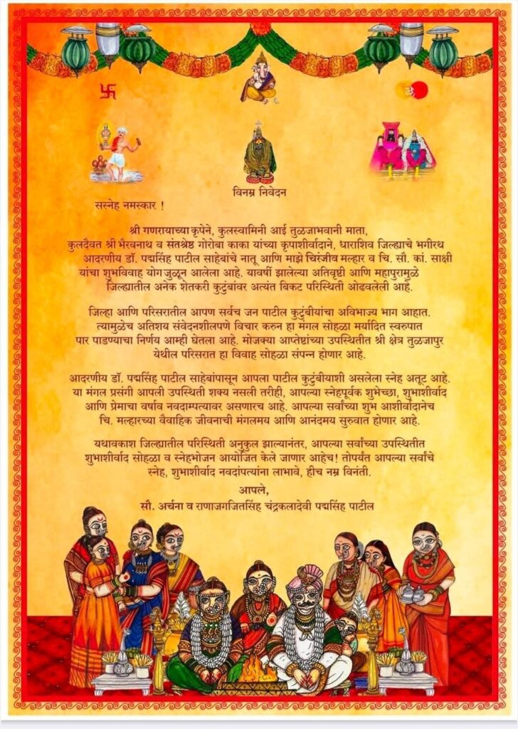 श्री गणरायाच्या कृपेने, कुलस्वामिनी आई तुळजाभवानी माता, कुलदैवत श्री भैरवनाथ व संतश्रेष्ठ गोरोबा काका यांच्या कृपाशीर्वादाने, धाराशिव जिल्ह्याचे भगीरथ आदरणीय डॉ. पद्मसिंह पाटील साहेबांचे नातू आणि माझे चिरंजीव मल्हार व चि. सौ. कां. साक्षी यांचा शुभविवाह योग जुळून आलेला आहे. यावर्षी झालेल्या अतिवृष्टी आणि महापुरामुळे जिल्ह्यातील अनेक शेतकरी कुटुंबांवर अत्यंत बिकट परिस्थिती ओढवलेली आहे.